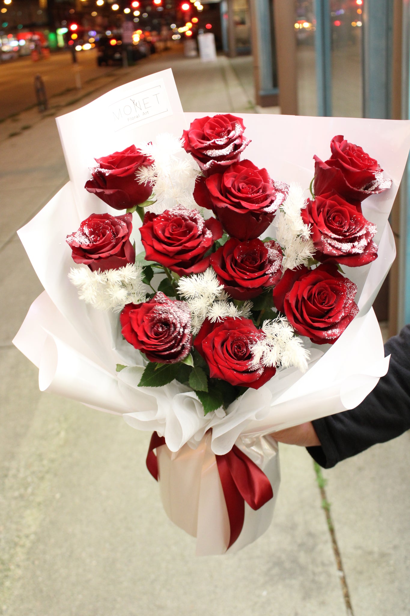 Experience the magic of the holiday season with Let It Snow - a premium red rose bouquet adorned with delicate artificial snowflakes. Perfect for expressing your love and spreading festive cheer to your special someone during Christmas.